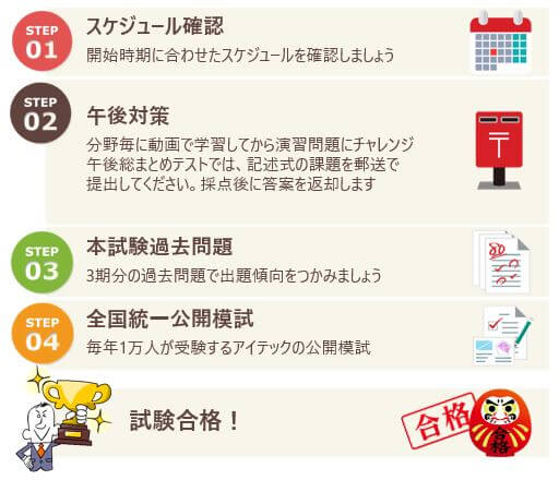 アイテックが40年以上ノウハウを培ってきた書籍でインプット学習を行い、時間・場所問わず学習できるe-learningでアウトプット学習。本試験直前の総まとめを公開模試で行います。